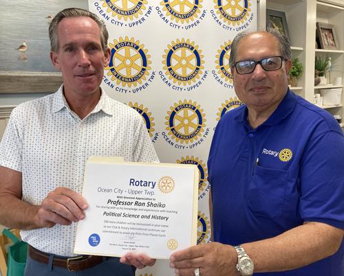 Professor Ron Shaiko, now retired from the faculty of Dartmouth University, was the guest speaker for the Ocean City - Upper Township Rotary Club dinner meeting on Thursday, August 14, 2025. OCUT Rotary Club President Aslam Sheikh present a certificate of appreciation, noting that the Club will make a donation for 200 children to be immunized in his name as our Club and Rotary International continues our commitment to eradicate Polio from Planet Earth.